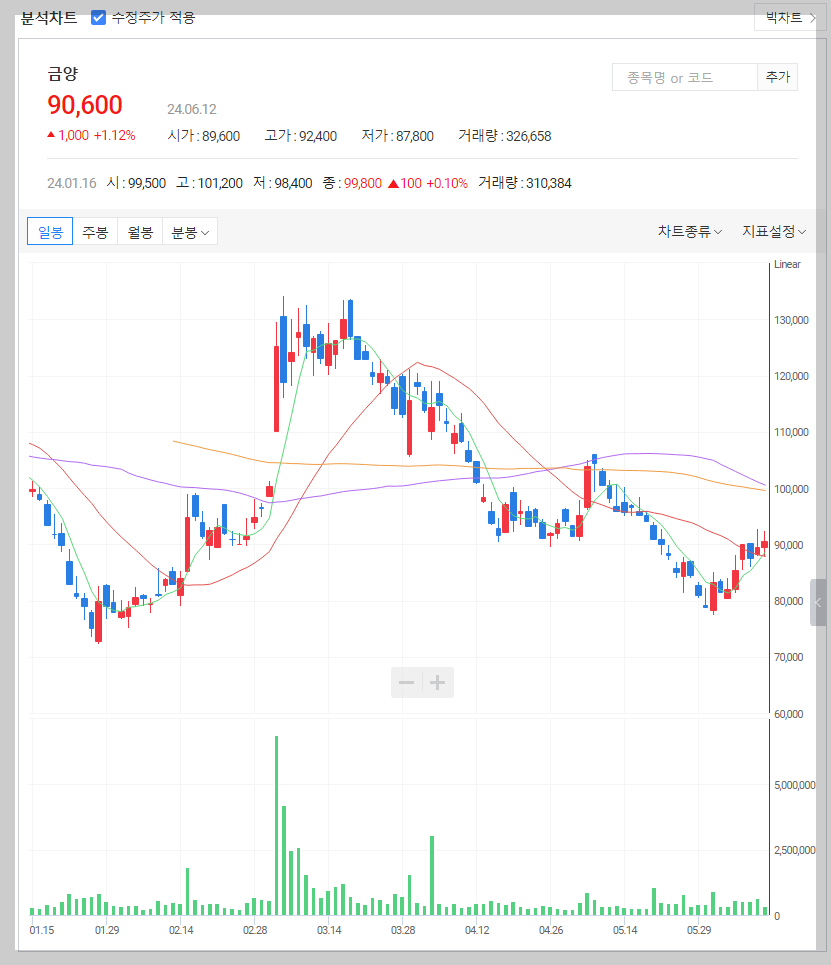 금양 전일 주가는 89,600원이며 전일 대비 1,000원 상승한 모습을 보이고 있습니다. 금양의 주주현황을 살펴보면 류광지 주주가 전체 지분 36.29%를 소유하고 있습니다. 금양은 화학 기업으로 장중 기준으로 주가는 89,600원입니다. 금양의 시가 총액은 5조 2593억 원이며 발행 주식수는 58,050,037주입니다. 외국인 보유 비중은 14.06%이며 장중 거래량은 648,697원 을 기록했습니다. 매출액은 376억 원을 달성했습니다. EPS는 -1,040원이며 금양 주식 배당수익률은 0.00%입니다.