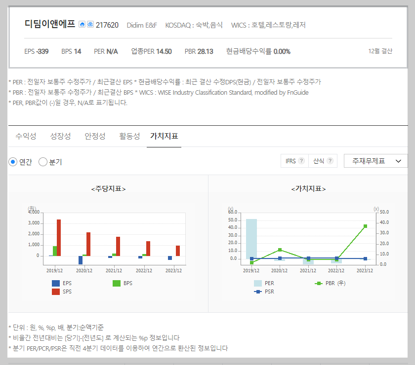 디딤이앤에프 현재 주가는 381원이며 거래 정지 상태 있습니다. 디딤이앤에프의 주주현황을 살펴보면 김상훈 주주가 전체 지분 8.21%를 소유하고 있습니다. 디딤이앤에프는 호텔 및 레저 기업으로 장중 기준으로 주가는 381원입니다. 디딤이앤에프의 시가 총액은 220억 원이며 발행 주식수는 57,747,210주입니다. 외국인 보유 비중은 0.30%이며 장중 거래량은 0원 을 기록했습니다. 매출액은 117억 원을 달성했습니다. EPS는 -339원이며 디딤이앤에프 주식 배당수익률은 0.00%입니다.