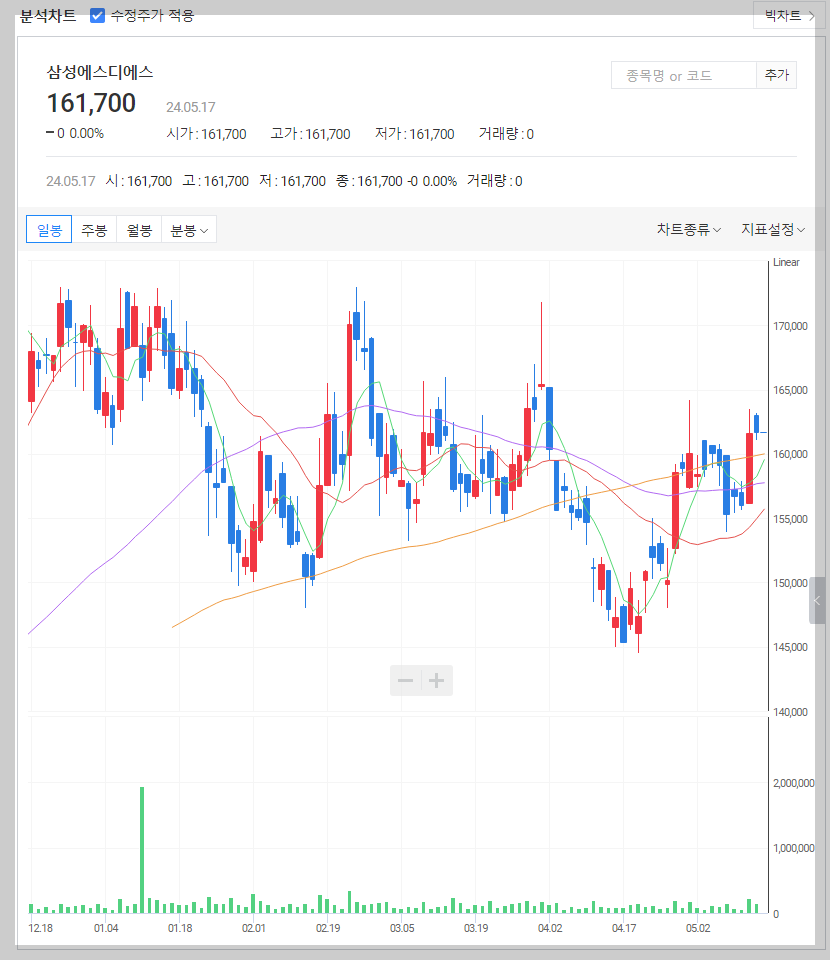 삼성에스디에스 현재 주가는 161,700원이며 전일 대비 +100원의 모습을 보이고 있습니다. 삼성에스디에스의 주주현황을 살펴보면 삼성전자 주주가 전체 지분 48.98%를 소유하고 있습니다. 삼성에스디에스는 IT 서비스 기업으로 장중 기준으로 주가는 161,700원입니다. 삼성에스디에스의 시가 총액은 12조 5120억 원이며 발행 주식수는 77,377,800주입니다. 외국인 보유 비중은 19.01%이며 장중 거래량은 237,092원 을 기록했습니다. 매출액은 132,768억 원을 달성했습니다. EPS는 10,548원이며 삼성에스디에스 주식 배당수익률은 1.59%입니다.