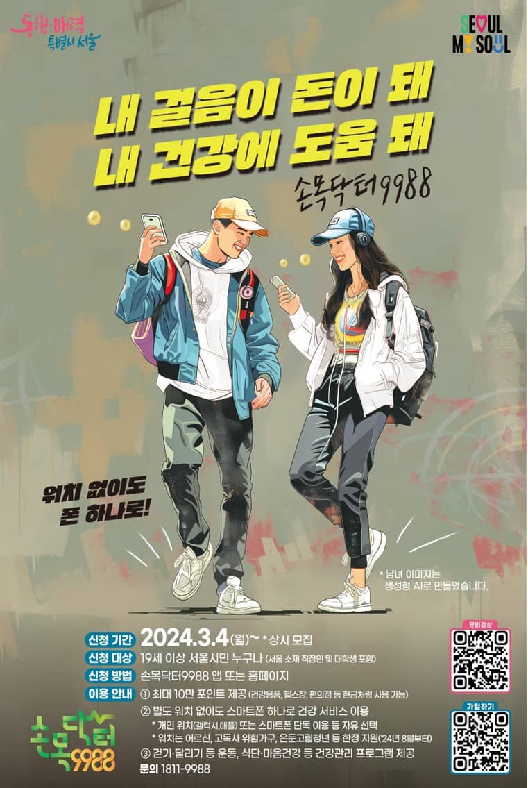서울시는 '손목닥터 9988' 프로젝트로 스마트폰이나 스마트워치를 활용해 걷기 활동을 기록하고, 이를 통해 포인트를 모을 수 있는 서울형 헬스케어 프로젝트를 운영하고 있습니다. 2021년부터 시작된 이 프로젝트에는 이미 45만 명이 참여하고 있으며, 올해 안에는 100만 명의 참여를 목표로 하고 있습니다.