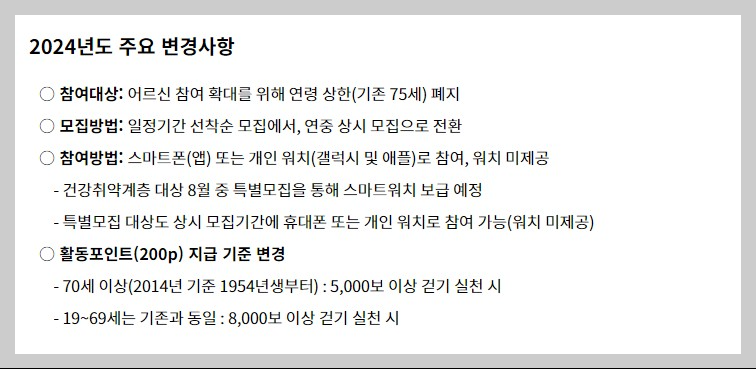 서울시는 이 프로젝트가 더 많은 시민들에게 열려 있도록 개선해 왔습니다. 선착순 모집에서 연중 상시모집으로 변경하였으며, 스마트폰만 있어도 참여할 수 있게 했습니다. 또한, 연령 제한을 없애고, 70세 이상의 어르신들은 걸음 포인트 달성 기준을 낮췄습니다.