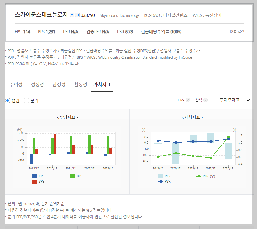 기업 가치 평가에는 여러 가지 방법이 있지만, 그중에서도 기술 지표를 활용하는 방법을 소개합니다. 스카이문스테크놀로지는 전체 기술주 2,095개 기업 중 1,423위 등급인 입니다. 대표 섹터 평가 기업 중 등급인 입니다. 대표 테마 평가 기업 중에서는 를 차지했습니다. 이를 바탕으로 투자 매력도를 평가해 보면 전체 기술주, 대표 섹터, 대표 테마의 결과를 얻을 수 있습니다. 동종분야 기업들의 평균적인 기술력 대비 주가에 비하여 현재 동사의 기술력 대비 주가는 고평가 되어 있습니다.