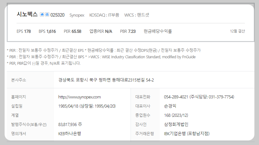 시노펙스는 휴대폰 및 관련부품 기업입니다. 대표자는 손경익이며 설립일은 1985/04/18, 주식 상장일은 1995/04/20입니다. 전체 종업원 수는 168명이고 본사 주소는 경북 포항시 북구 청하면 동해대로 2315번 길 54-4입니다.