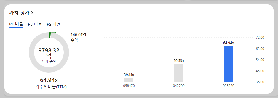 기업 가치 평가에는 여러 가지 방법이 사용되지만, 그중에서 기술 지표를 활용하는 방식을 소개합니다. 시노펙스는 전체 기술주 2,091개 기업 중 477위 등급인 입니다. 대표 섹터 평가 기업 중 등급인 입니다. 대표 테마 평가 기업 중에서는 를 차지했습니다. 이를 바탕으로 투자 매력도를 평가해 보면 전체 기술주, 대표 섹터, 대표 테마의 결과를 얻을 수 있습니다. 동종분야 기업들의 평균적인 기술력 대비 주가에 비하여 현재 동사의 기술력 대비 주가는 고평가 되어 있습니다.