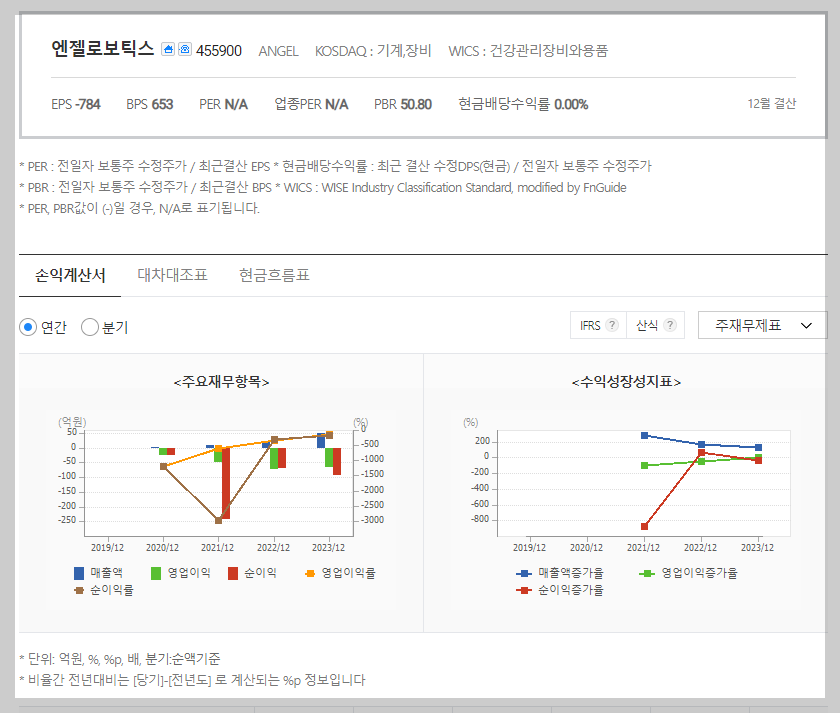 -2023년 3분기 기준, 매출액 3,744백만 원, 영업손실 4,926백만 원, 당기순손실 7,817백만 원. 매출액 규모가 꾸준히 성장 및 영업손실 규모는 감소 중. 동사의 핵심 제품인 angel MEDI(재활의료 전문 웨어러블 로봇)을 비롯하여 산업용, 일상생활 보조용, 모터드라이버, 국방용 등으로 활용되고 있음. 현재 동사의 주력 제품은 angel MEDI 브랜드의 엔젤렉스 M20과 angel GEAR 브랜드의 ANGEL X임.