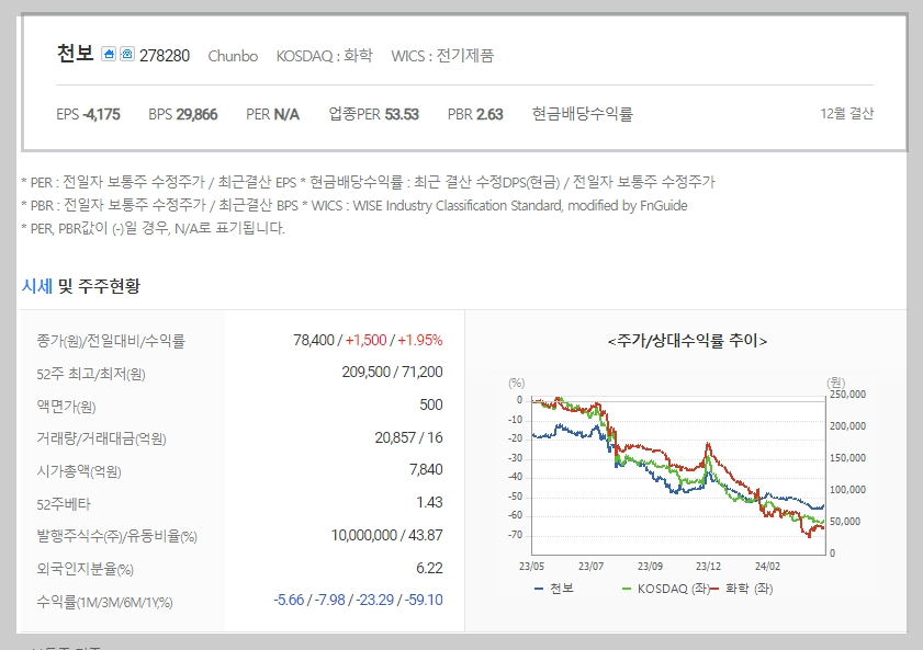 천보 현재 주가는 78,400원이며 전일 대비 +1,500원의 모습을 보이고 있습니다. 천보의 주주현황을 살펴보면 이상율 주주가 전체 지분 55.43%를 소유하고 있습니다. 천보는 전자 장비 및 기기 기업으로 장중 기준으로 주가는 78,400원입니다. 천보의 시가 총액은 7840억 원이며 발행 주식수는 10,000,000주입니다. 외국인 보유 비중은 6.22%이며 장중 거래량은 20,857원 을 기록했습니다. 매출액은 1,827억 원을 달성했습니다. EPS는 -195원이며 천보 주식 배당수익률은 7,840%입니다.