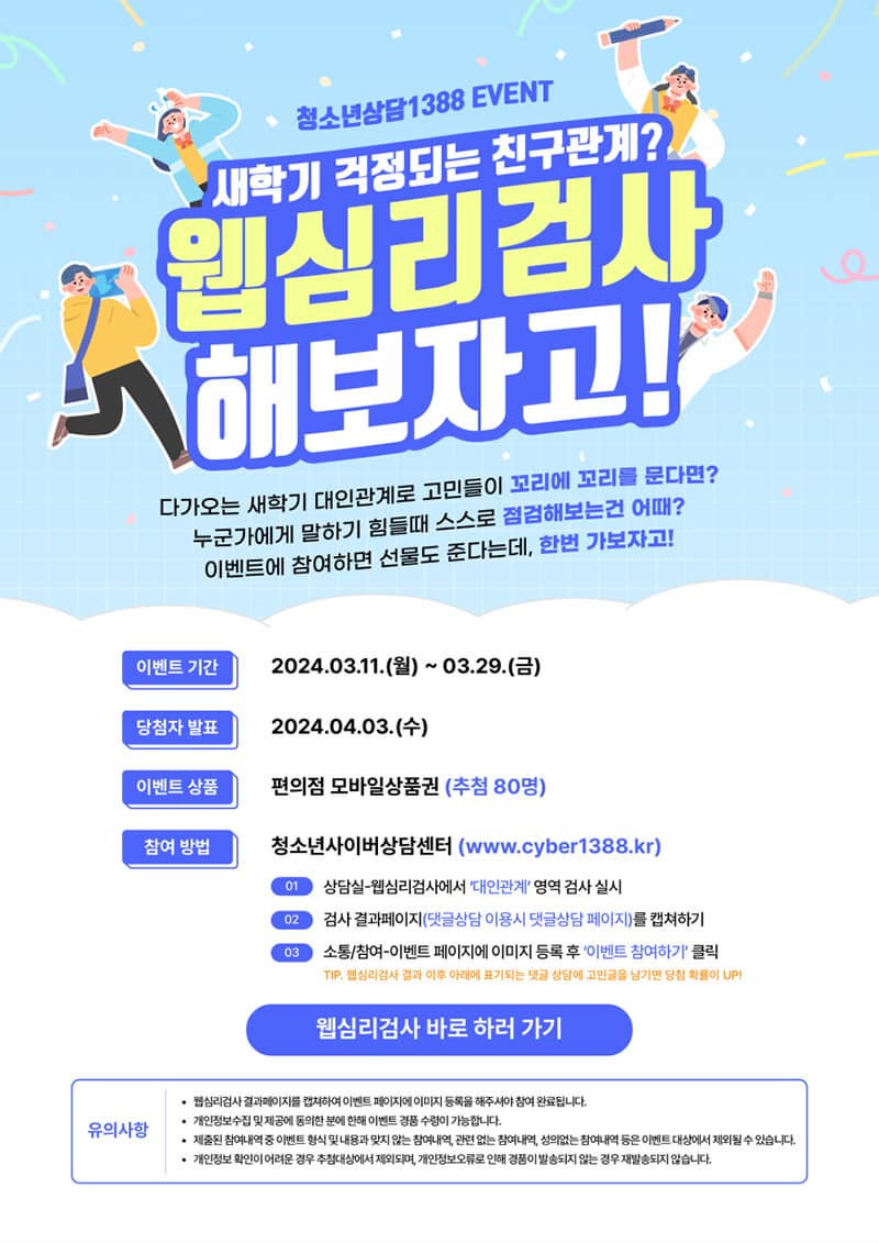 또한, 웹심리검사에 참여하는 청소년들을 위한 이벤트도 준비되어 있습니다. 웹심리검사를 완료하고 결과 페이지와 댓글 상담 내역을 캡처하여 이벤트 페이지에 등록하면, 추첨을 통해 80명에게 모바일 기프트카드가 제공됩니다.