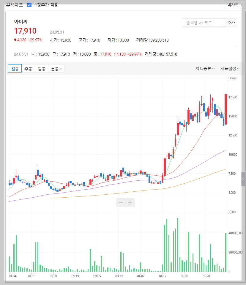 와이씨의 현재 주가는 17,910원이며, 전일 대비 4,130원 상승하여 상한가를 기록하고 있습니다. 주주 현황을 살펴보면, 샘텍이 전체 지분의 51.98%를 보유하고 있습니다. 반도체 및 관련 장비를 제조하는 와이씨의 주가는 장중 17,910원을 유지하고 있습니다. 시가총액은 약 1조 4694억 원이며, 발행 주식 수는 82,045,350주입니다. 외국인의 보유 비중은 1.90%이고, 장중 거래량은 40,157,518원을 기록했습니다. 매출액은 340억 원이며, EPS는 390원, 배당수익률은 5.33%입니다.