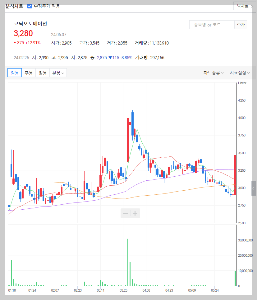 코닉오토메이션 전일 주가는 2,905원이며 전일 대비 375원 상승한 모습을 보이고 있습니다. 코닉오토메이션의 주주현황을 살펴보면 APS홀딩스 주주가 전체 지분 72.72%를 소유하고 있습니다. 코닉오토메이션은 IT 서비스 기업으로 장중 기준으로 주가는 2,905원입니다. 코닉오토메이션의 시가 총액은 1401억 원이며 발행 주식수는 41,503,222주입니다. 외국인 보유 비중은 0.00%이며 장중 거래량은 167,394원 을 기록했습니다. 매출액은 21억 원을 달성했습니다. EPS는 56원이며 코닉오토메이션 주식 배당수익률은 %입니다.