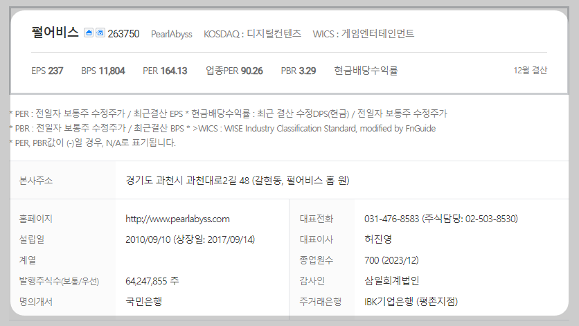 펄어비스는 게임 소프트웨어 기업입니다. 대표자는 허진영이며 설립일은 2010/09/10, 주식 상장일은 2017/09/14입니다. 전체 종업원 수는 700명이고 본사 주소는 경기도 과천시 과천대로 2길 48 (갈현동, 펄어비스 홈 원)입니다.