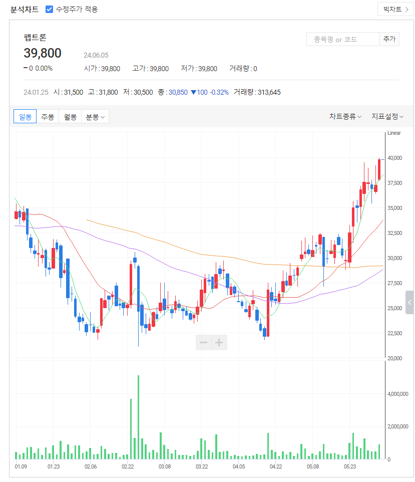 펩트론의 현재 주가는 39,800원이며, 전일 대비 2,550원 상승했습니다. 주주 현황을 보면, 최호일 주주가 전체 지분의 9.46%를 보유하고 있습니다. 펩트론은 바이오 기업으로, 장중 주가도 39,800원입니다. 시가총액은 8,209억 원, 발행 주식수는 20,626,853주입니다. 외국인 보유 비중은 6.67%, 장중 거래량은 914,709주를 기록했습니다. 매출액은 5억 원이며, EPS는 -772이고, 펩트론의 주식 배당수익률은 1.00%입니다.
