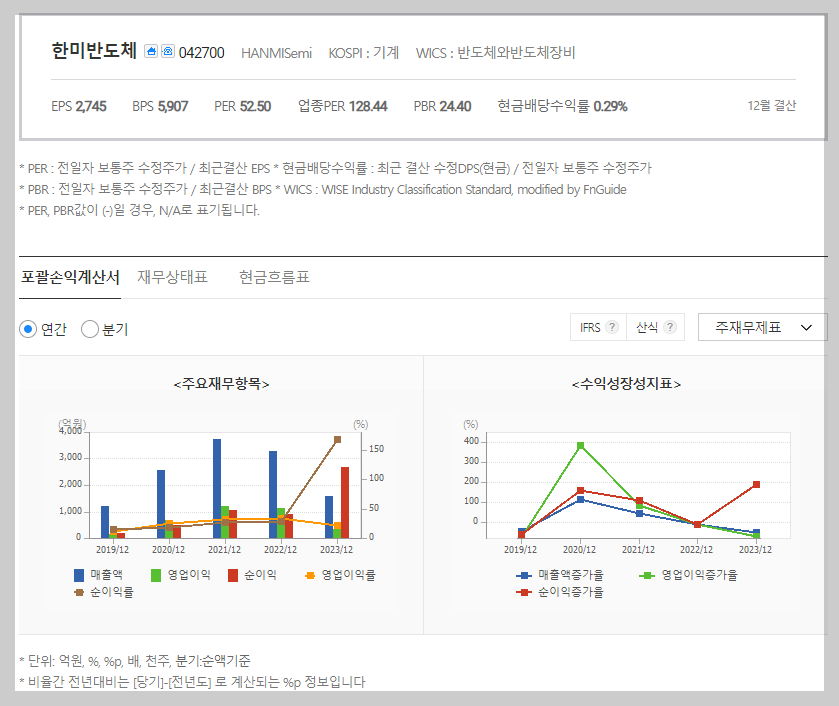 -2023년 12월 전년동기 대비 연결기준 매출액은 51.5% 감소, 영업이익은 69.1% 감소, 당기순이익은 189.6% 증가. 주요 고객사들의 설비투자 축소로 이어져 우리 한미반도체 실적도 지난 2021년, 2022년 대비 크게 감소했음. 고대역폭메모리 HBM의 수요가 급증하면서, 전 세계 HBM 1위 제조사인 SK하이닉스로부터 2023년 9월부터 올해까지 누적 1,872억 원 규모의 수주를 따냄.