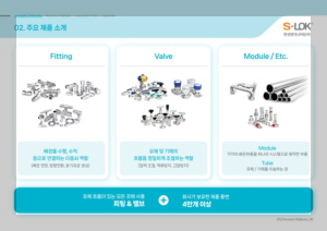 -동사는 계측장비용(이하, 계장용) 피팅, 밸브 및 플러밍 전문 기업임. 석유화학, 조선, 해양, 방산, 육상/해상 플랜트, 우주항공, 반도체, 디스플레이, 수소연료전지, ESS 등 유체 흐름의 제어가 필요한 산업군에 S-LOK이라는 브랜드로 제품을 제조하여 판매하고 있음. 2012년 계장용 피팅 및 밸브 업체인 새한엔텍㈜의 시설 및 자산을 양수하여 계장용 피팅 및 밸브 제품에 대한 개발 및 생산을 시작함.
