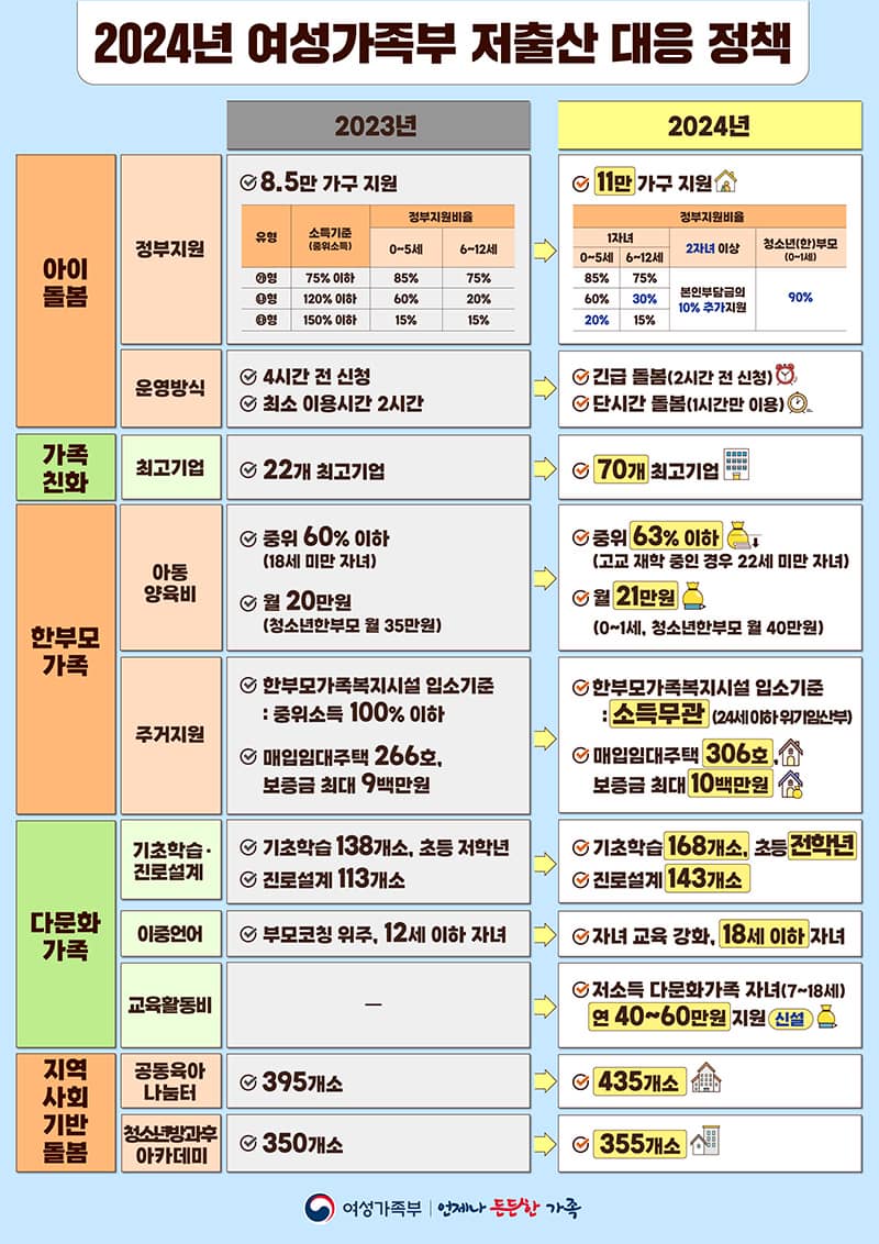 이러한 아이 돌봄 서비스 확대와 가족친화 최고기업 증가는 저출산 문제를 해결하기 위한 중요한 노력입니다. 이 두 가지 방안을 통해 양육 부담을 줄이고 가정과 직장의 균형을 이루는 사회를 만들어 나가기를 기대해 봅니다.