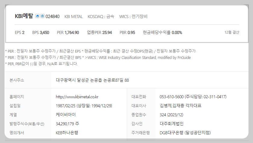 KBI메탈은 전기장비 기업입니다. 대표자는 김병제, 김재충 각자대표이며 설립일은 1987/02/25, 주식 상장일은 1994/12/29입니다. 전체 종업원 수는 324명이고 본사 주소는 대구시 달성군 논공읍 논공로 87길 88 갑을메탈 대구공장입니다.