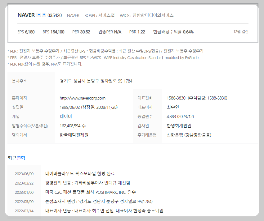 NAVER는 인터넷 서비스 회사로, 대표자는 최수연이며, 설립일은 1999년 6월 2일이고, 주식 상장일은 2008년 11월 28일입니다. 종업원 수는 4,383명이며, 본사 주소는 경기도 성남시 분당구 정자일로 95, 1784번지입니다.